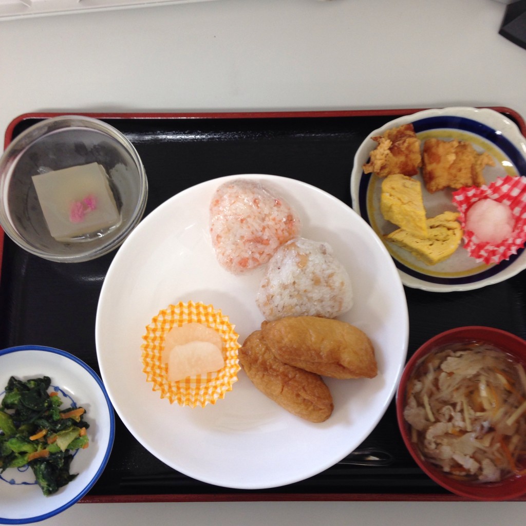 お花見弁当(おにぎり、お稲荷、から揚げ、卵焼き、菜っ葉和え物、筍入り豚汁、桜ゼリー)