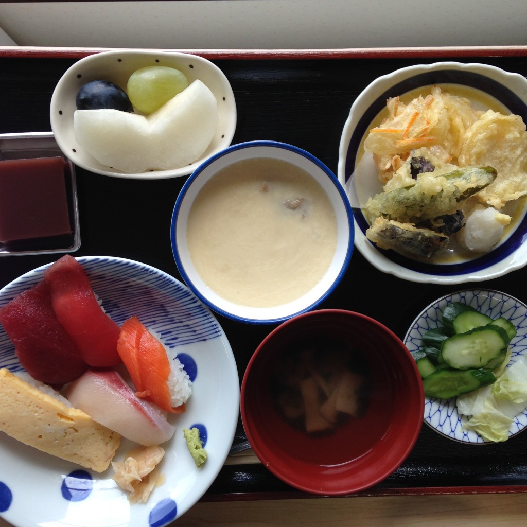 敬老祝い膳:寿司、天ぷら、茶碗蒸し、水羊羹など